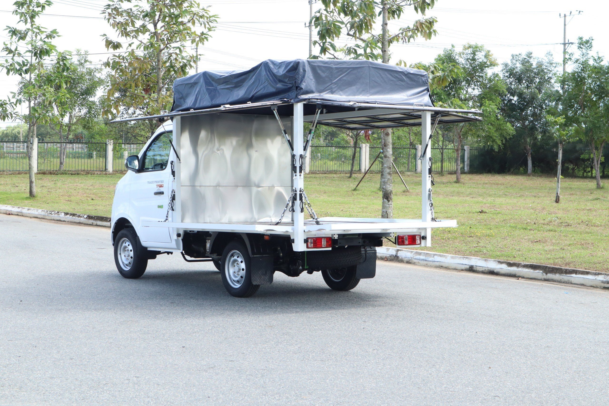 - Thùng mui bạt mở vỹ với đa công, kết hợp giữa vận chuyển hàng hóa và mua bán hàng hóa trực tiếp trên thùng xe
