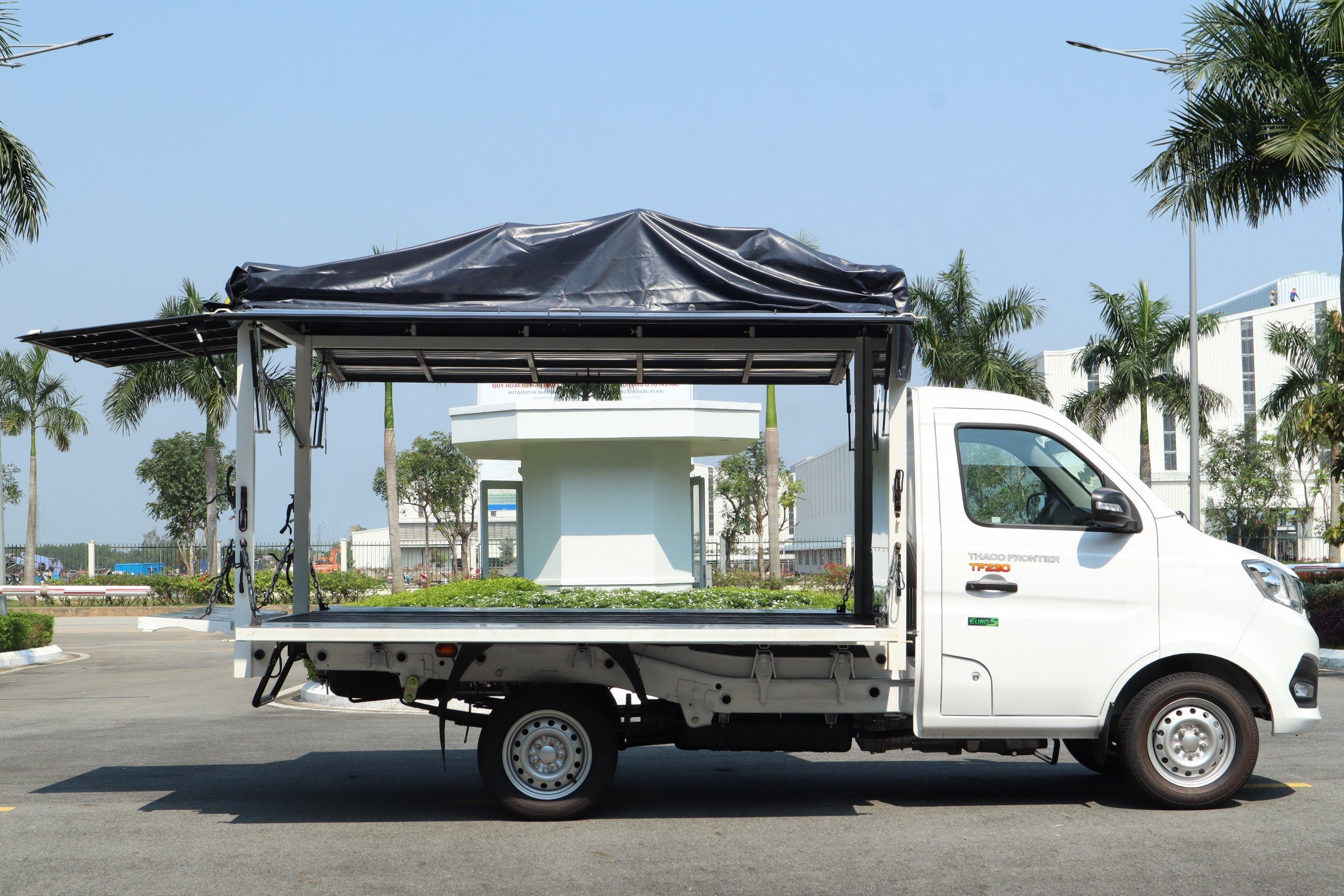 - Khung vỹ trên bửng mở lật lên 85 độ (có ty hơi trợ lực) để làm mái che, thuận tiện bán hàng.